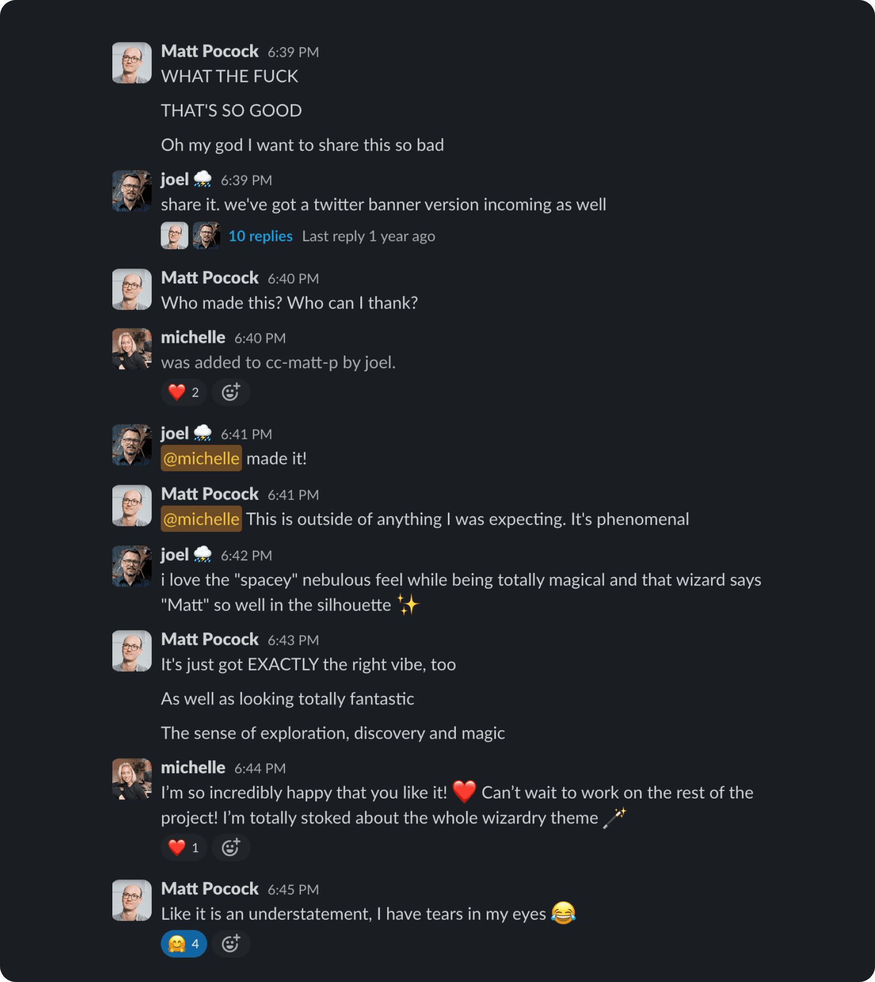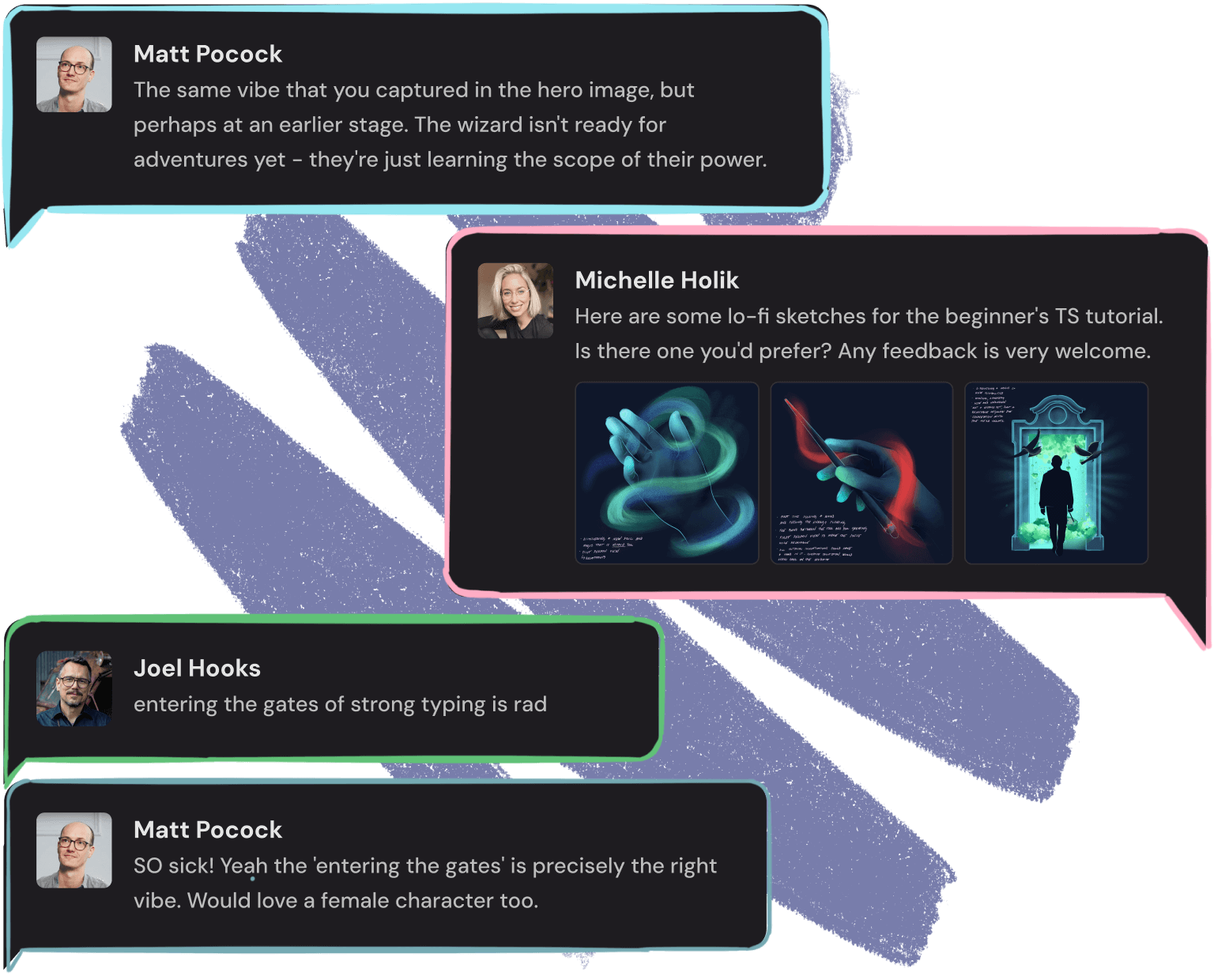 Matt’s reaction in Slack when we shared Michelle’s first illustration for Total TypeScript.