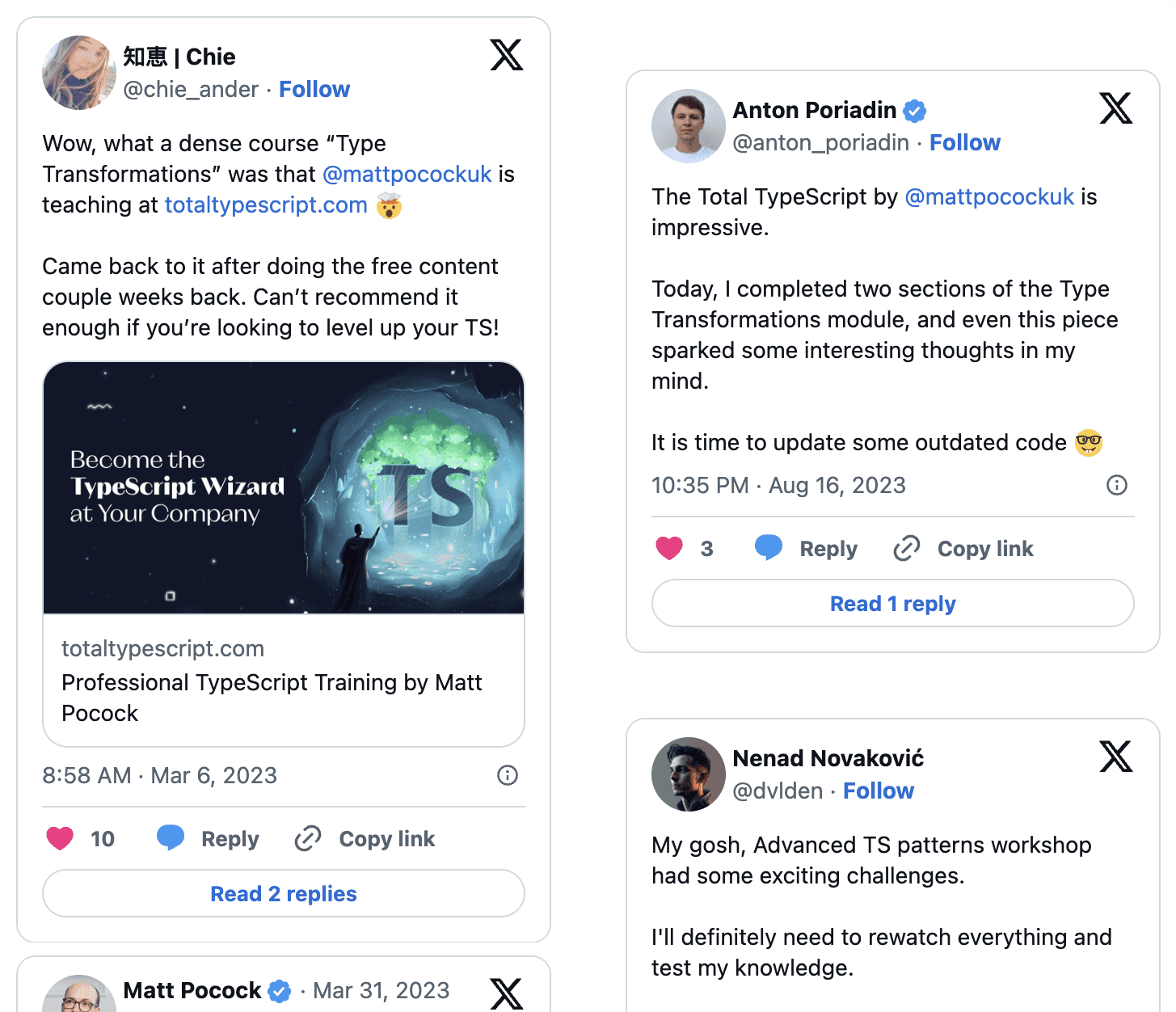 Matt doesn’t just push out information, he actively engages in answering people’s questions about Total TypeScript and is enthusiastic about doing so.